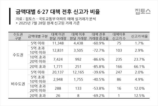 거래량은 줄었지만, 외려 신고가 비율은 늘었다. 수도권에서 20억 원 초과 아파트 거래량은 6·27 대책 이전 한 달(1771건) 대비 85.8% 감소해 251건을 기록했다. 그런데 신고가 비율은 66.1%(166건)으로 전 가격대에서 가장 높았다.
