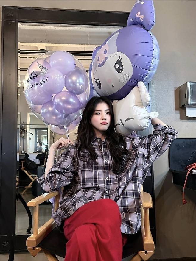 한소희는 체크 패턴 셔츠에 레드 팬츠를 매치해 편안하면서도 러블리한 무드를 완성했습니다.