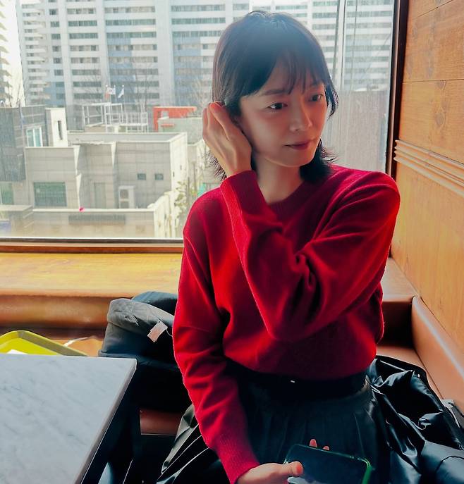전소민은 빨간색 니트 톱과 블랙 팬츠를 매치해 세련된 카페 데이트룩을 연출하고 있다. 창가에 앉은 모습에서 자연스러운 포즈와 함께 따뜻한 컬러의 니트가 겨울철 실내 분위기와 완벽하게 조화를 이루고 있다. 심플하면서도 포인트가 되는 레드 컬러 선택으로 세련미를 더했다.