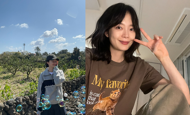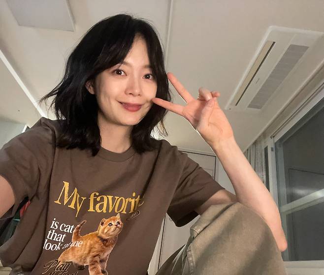 실내에서 촬영된 셀카에서는 브라운 컬러의 고양이 프린트 티셔츠를 착용해 귀여운 매력을 어필하고 있다. 'My favorite'라는 문구와 함께 고양이 이미지가 프린트된 티셔츠로 개성 있는 스타일을 연출했다. V자 포즈와 함께 밝은 표정으로 친근하고 사랑스러운 이미지를 완성하고 있다.