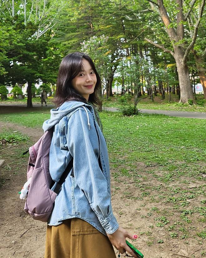 공원에서의 산책 모습에서는 오버사이즈 데님 재킷을 활용한 레이어드 스타일링을 선보이고 있다. 연청 데님 재킷 안에 후드티를 레이어드하고 머스타드 컬러 하의를 매치해 컬러풀한 조합을 완성했다. 핑크 백팩을 포인트 아이템으로 활용해 전체적으로 발랄하고 트렌디한 스트리트 패션을 연출하고 있다.