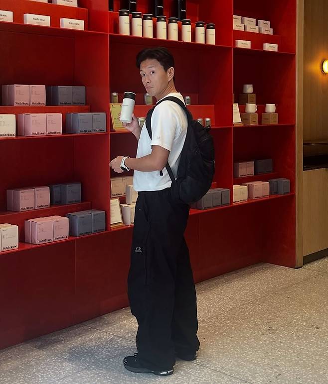 진태현이 뉴욕의 한 감각적인 매장에서 포착됐다. 선반 가득 정돈된 텀블러와 박스들이 눈길을 끄는 공간에서 진태현은 시크하면서도 편안한 데일리룩으로 시선을 사로잡았다. 화이트 반팔 티셔츠에 오버핏 블랙 팬츠, 그리고 블랙 백팩과 스니커즈까지, 심플한 컬러 조합으로 도시적인 세련미를 보여줬다.