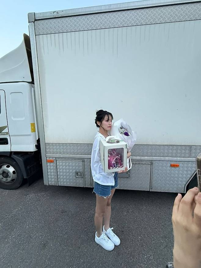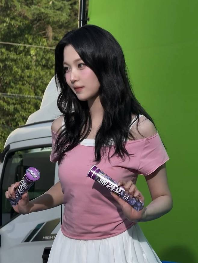 헤어는 귀여운 업두 스타일로 연출해 얼굴을 더욱 작아 보이게 하며, 부드러운 웨이브 앞머리가 걸리시한 매력을 더했다. 한 손에는 자주색 포장지의 스틱 아이스크림, 다른 한 손에는 분홍빛 플라스틱 병 아이스크림을 들고 사랑스러운 눈웃음을 짓는 그녀의 모습은 ‘여름 요정’ 그 자체다.