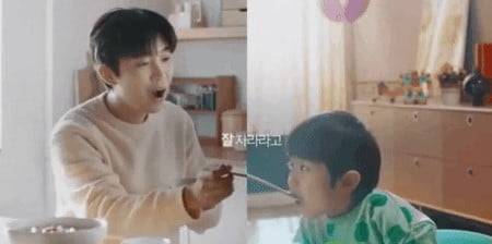 TV 광고 속 임영웅은 한 아이가 잘 자라길 바라는 마음을 담아 죽을 떠서 직접 입에 넣어준다.