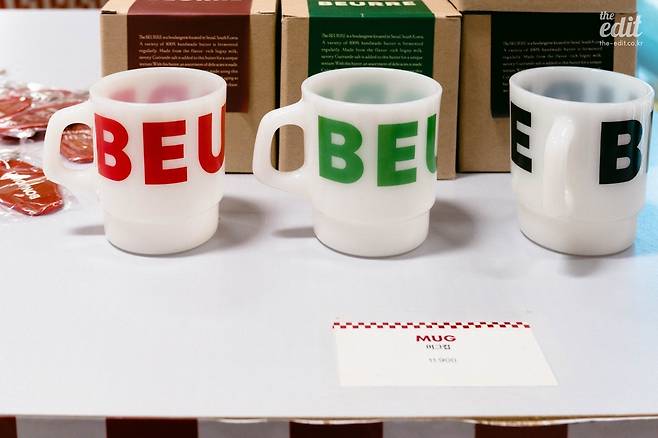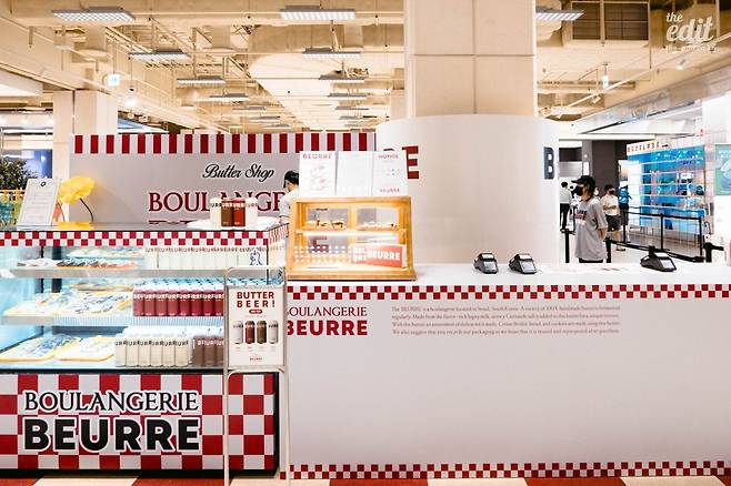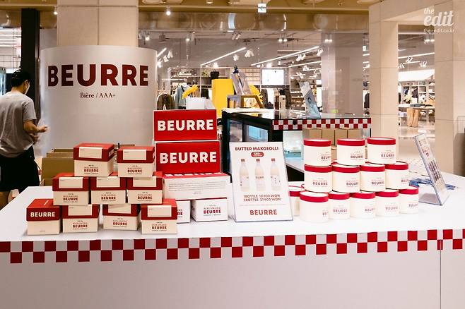 팝업스토어는 베이지와 버건디 두 가지 컬러로 차분하게 꾸며놓았고, 텍스트는 거의 알파벳만 사용했다. ‘BEURRE’라는 타이포그래피 덕분에 프랑스에서 온 브랜드처럼 보인다. BEURRE는 불어로 ‘버터’라는 뜻. 한 가지 흥미로운 점은 블랑제리뵈르의 대표가 어반자카파의 보컬 박용인이라는 것이다. 어반자카파의 노래 잘하는 그 분이 언제 사업을 시작하셨을까 싶었는데, 2016년부터 이자카야를 운영했고 2020년에는 마니에라는 패션 브랜드를 런칭했다. 마니에 역시 모태 프랑스 브랜드처럼 브랜딩을 한 터라 블랑제리뵈르와 결이 비슷하다.