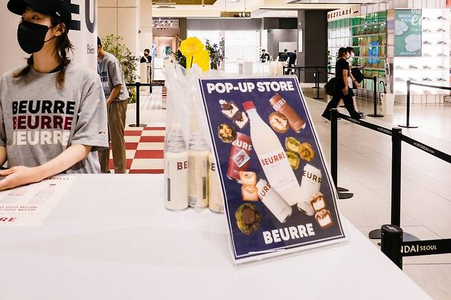 블랑제리뵈르@beurre_seoul(https://bit.ly/3A2e03r)는 버터 브랜드다. 버터를 기반으로 여러 가지 제품을 만든다. 수제 버터를 팔고, 휘낭시에, 르뱅쿠키 같은 베이커리 메뉴도 있다. 수제 버터는 들깨버터, 김치버터처럼 낯선 맛이 있어서 궁금했는데, 더현대 서울 팝업에서는 판매하지 않아서 구매할 수 없었다. 그리고 오늘 나의 구매 타깃은 인스타그램에서 요즘 핫해진 버터 맥주다.