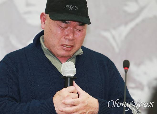 | ▲ 진실화해를위한과거사정리위원회가 26일 부산시의회 브리핑룸에서 '부산 ‘영화숙·재생원 사건' 관련 진실규명과 권고안을 발표한 가운데, 피해생존자 중 한 명인 장예찬씨가 울먹이며 발언하고 있다. |
