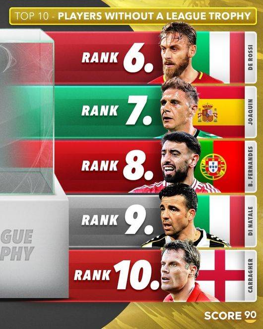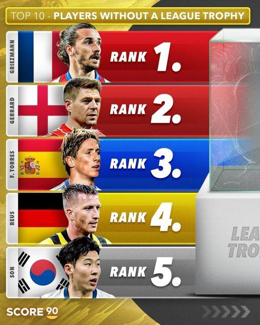 축구 콘텐츠 매체 '스코어 90'은 27일(한국시간) 소셜 미디어를 통해 '21세기 리그 우승 트로피가 없는 선수 TOP 10'을 선정해 발표했다.