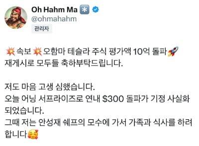 지난 10일 ‘We, Robot’ 행사 직후 무너졌던 주가에 실망했던 주주들도 웃음을 되찾았습니다. X(옛 트위터)에서 회원 1만8000여명의 테슬라 주주 커뮤니티를 운영하는 Oh Hahm Ma는 25일 테슬라 3000주를 보유한 주식계좌 인증샷을 올렸습니다. 그는 “하루에만 수익 2억원을 올려 계좌평가액 10억원을 돌파했다”며 “테슬라 주가 300달러 돌파 시 (흑백요리사) 안성재 셰프의 고급식당 ‘모수’에 가서 식사하겠다”고 밝혔습니다.