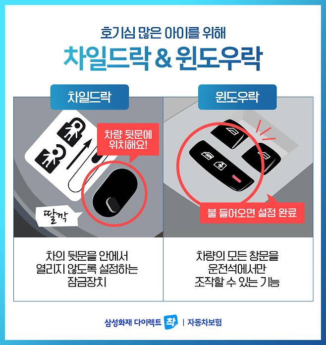 차에 타면 이것저것 눌러보느라 정신이 없는 우리 아이들! 이때 함부로 문을 열거나 창문을 열면 위험한 상황이 발생할 수 있는데요. 만일의 사고를 방지하기 위해 준비된 기능들이 있으니 바로 차일드락 & 윈도우락 기능입니다. 많은 분들이 의외로 이 기능을 모르고 계신데요. 차일드락 & 윈도우락의 경우 옵션이 아닌 모든 차에 기본으로 적용되어 있는 기능입니다.