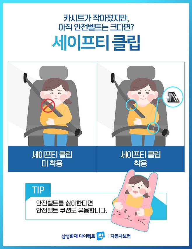 차량 내부에 부착된 안전벨트의 경우 성인 체형에 맞춰 나오기 때문에 어린이에게는 맞지 않는데요. 카시트를 사용하여 안전벨트를 아이 몸에 맞추면 되지만 아이가 많이 답답해할 수 있습니다. 이럴 때 사용하면 좋은 것이 바로 세이프티 클립인데요. 체구가 작은 어린이가 안전벨트를 착용할 경우 안전벨트의 끈이 어깨 중앙이 아닌 목 쪽에 위치하게 되고 이 경우 사고 발생 시 위험한 상황을 초래할 수 있습니다. 이때 세이프티 클립을 사용하여 어깨 중앙에 위치하도록 안전벨트를 조정해 주는 것이 좋습니다. 그래도 아이가 안전벨트를 불편해한다면 쿠션을 안전벨트에 끼우는 것도 좋은 방법입니다.