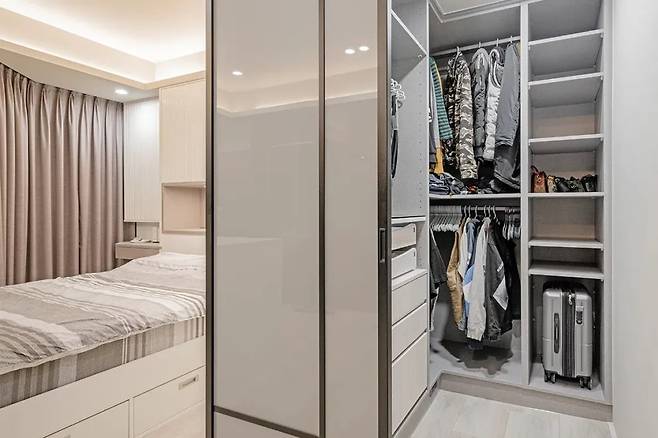 대학생이 된 딸의 방은 옅은 보라색과 흰색으로 그녀의 개성을 담았다. 충분한 옷장 수납 공간이 마련되어 있으며, 입구에는 드레스룸이, 내부에는 독서를 위한 책상 공간이 설계되어 있어 완벽한 개인 공간이 완성된다.