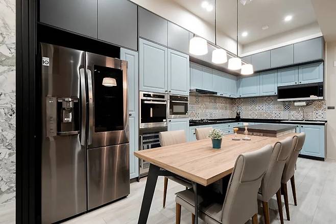 슬라이딩 글라스 도어가 공간을 나누자, 상반된 감성들이 동시에 존재한다. 주방에는 부드러운 곡선으로 마무리된 스카이블루 톤이 여성적인 분위기를 자아내고, 그 맞은편 목재 텍스처는 안정감을 준다.