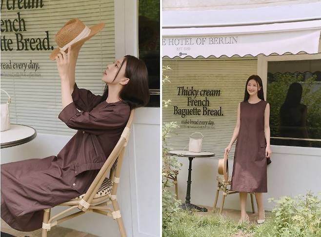 편안한 실루엣의 민소매 원피스에 스커트 부분의 아웃 포켓과 버튼으로 포인트가 센스 있게 디자인되었네요. 자켓은 단독으로도 착용해도 매력적인 아이템인데요.