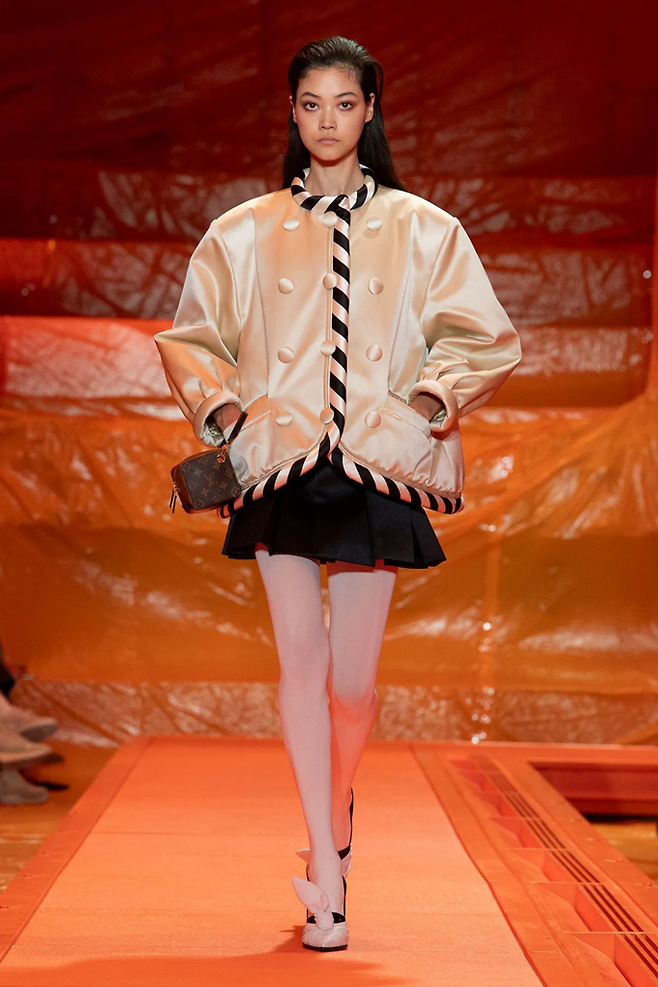 미우 미우는 마치 교복을 연상시키는 블레이저 재킷과 초미니 러플 스커트와 쇼츠를 매치한 쿨한 러블리 프레피룩으로 재창조했다.