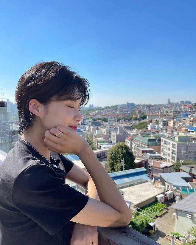 햇살이 비치는 옥상 위, 블랙 티셔츠에 짧은 머리카락이 어우러진 모습은 단정하면서도 도회적인 인상을 남겼습니다.