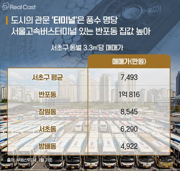 부동산R114에 따르면 1월 기준 반포동 아파트 3.3㎡당 평균 시세는 1억816만원으로 서초구 평균(7,493만원)을 크게 웃돌며 독보적 1위를 기록 중 입니다.