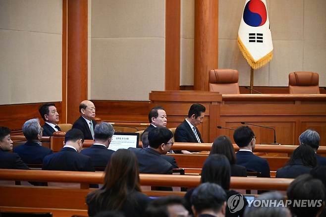 (서울=연합뉴스) 4일 서울 종로구 헌법재판소 대심판정에서 열린 윤석열 대통령 탄핵심판 선고에 정청래 국회 법사위원장 등 국회 탄핵소수단이 앉아 있다. 2025.4.4 [사진공동취재단]