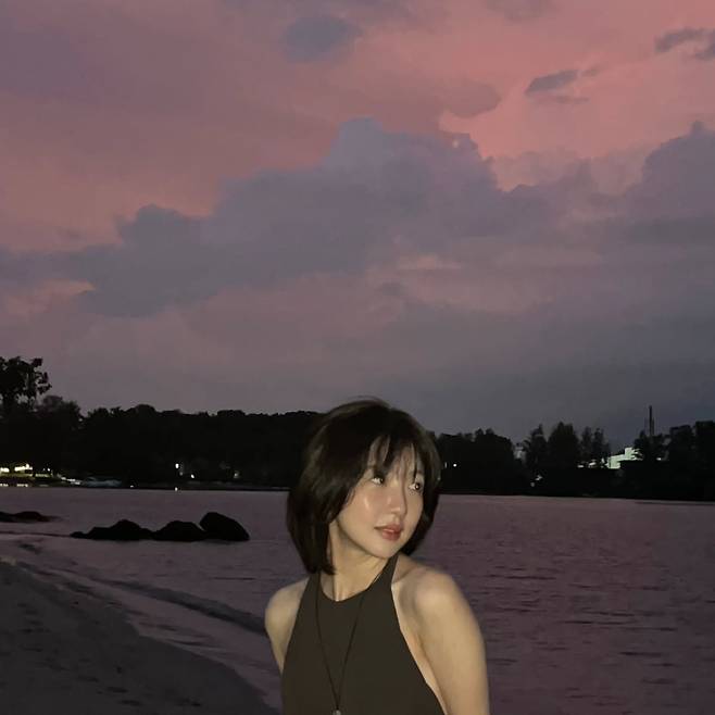 주현영이 보여준 이번 모습은 붉게 물든 노을과 보랏빛 구름이 어우러진 해변을 배경으로 본인만의 고혹적이고 우아한 매력을 극대화한 강렬한 차림이에요.