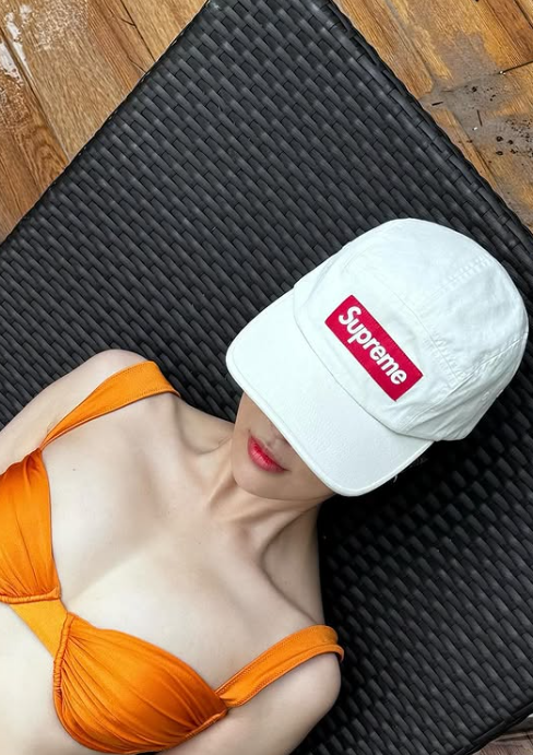 여기에 이주연 님은 화이트 컬러의 슈프림 로고 모자를 매치해 스포티한 무드를 더했어요. 슈프림 모자는 스트리트 감성과 캐주얼함을 동시에 살려주는 아이템이었죠.