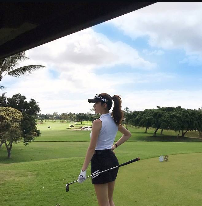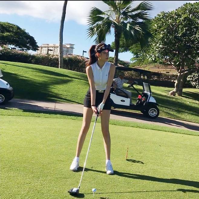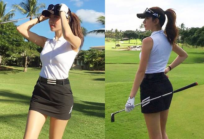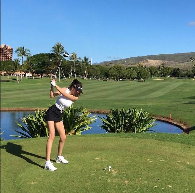 푸른 필드를 배경으로 블랙&화이트 조합의 세련된 골프룩을 선보인 예정화는 몸에 핏되는 슬리브리스 톱과 미니 스커트로 탄탄한 라인을 강조하며 프로 골퍼 못지않은 완벽한 스윙을 자랑했습니다.