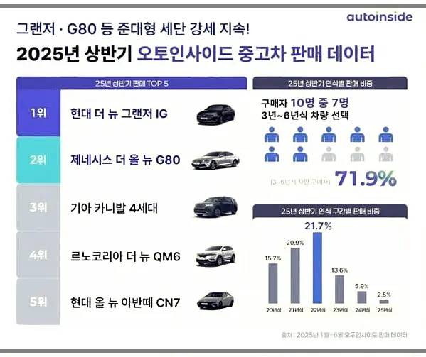 중고차 플랫폼 ‘오토인사이드’에 따르면, 2025년 상반기 기준 ‘더 뉴 그랜저 IG’는 전체 중고차 거래량의 7.1%를 차지하며 판매량 1위를 기록했다.