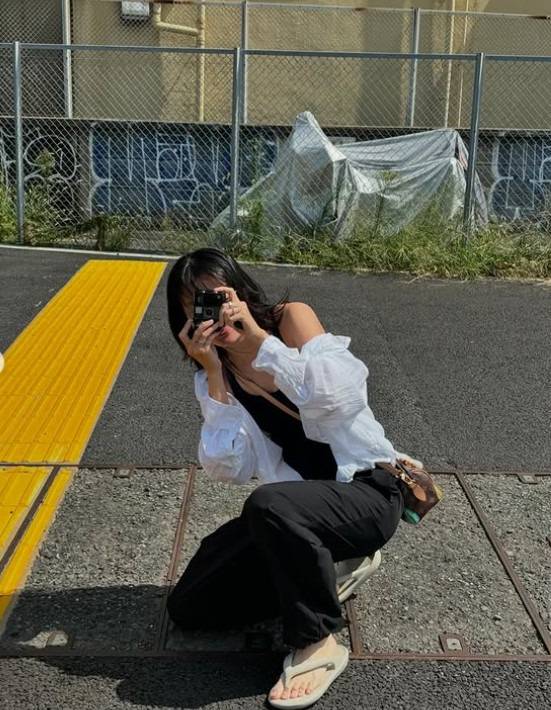 가벼운 샌들과 독특한 패치의 가방이 포인트. 한 끗을 살리는 센스예요.