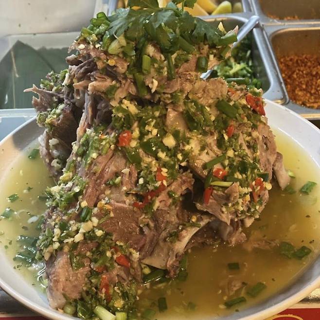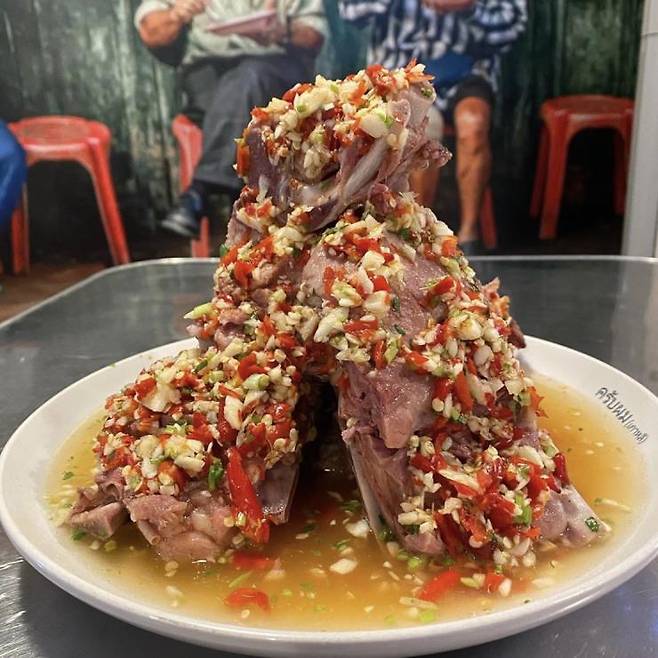 민니가 포장해 온 음식을 보고 뱀뱀이 반갑게 물었다. “이거 까폼?” 블랙핑크 리사도 인정한 압구정의 작은 태국 까폼. 테이블은 10개뿐이니 웨이팅은 감수해야 한다. 이곳의 진면목은 생김새부터 압도적인 돼지등뼈찜 ‘랭쎕’에서 엿볼 수 있다. 단, 양이 많아 소수로 방문한다면 족발 덮밥 ‘카오 카무’, 항정살 구이 ‘커무양’을 권한다.