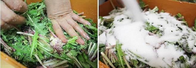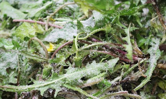 1.민들레를 물에 2~3회 흔들어 씻고, 식초물에 10분 담갔다가 헹군다.