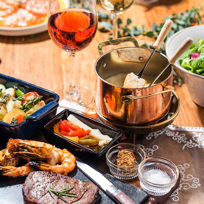 ‘어느 좌석에 앉아도 낭만적이다’라는 말이 있을 정도로 프로포즈하기 좋은 맛집으로 알려진 명동의 맛집. 블루리본만 7개를 보유 중이다. 이곳의 겨울 인기 메뉴는 바로 ‘시그니처 치즈 퐁듀 코스’. 치즈 퐁듀는 아메리칸 치즈, 스위스 치즈, 이탈리안 치즈 세 종류 중 하나를 고르면 된다. 이 중 원조를 제대로 맛보고 싶다면 역시 에멘탈, 라끌렛, 그뤼에르 조합의 스위스 치즈를 주문해보자. 여기에 안심 스테이크와 그릴 새우, 바게트 빵, 채소가 나오는데, 무엇을 찍어 먹어도 맛있다.