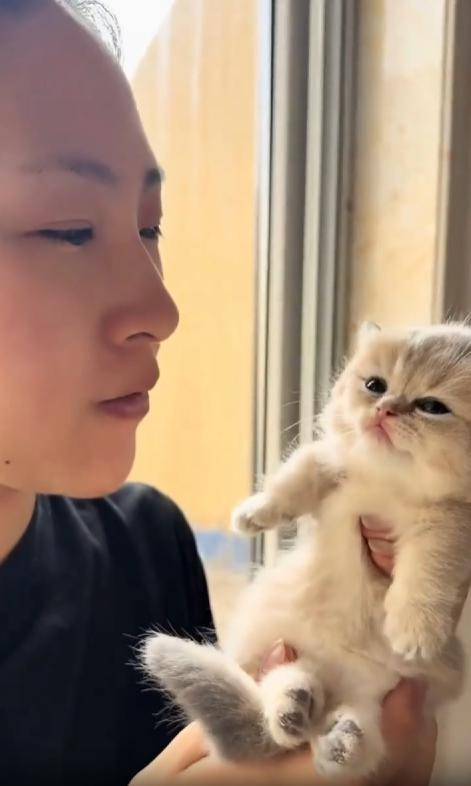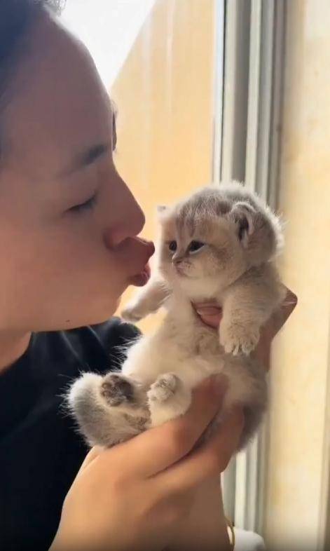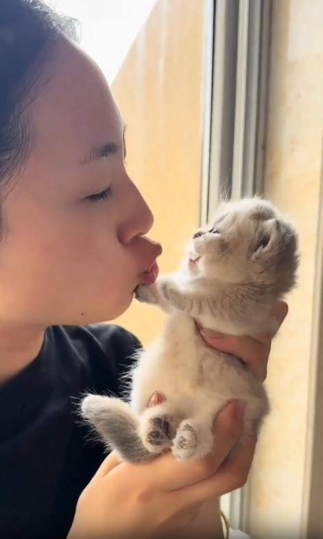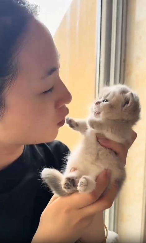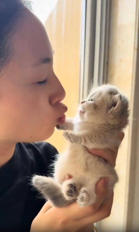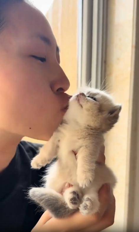 하지만 이 사랑스러운 소리에 주인은 더 이상 버틸 수 없습니다. “됐다, 이제 못 참아”라는 듯한 표정으로 고양이 얼굴에 그대로 입술을 가져가, 쭈욱—진하게 한 번 뽀뽀. 아니, 거의 얼굴 전체를 감싸듯 흡입에 가까운 애정 표현입니다. 새끼 고양이의 눈은 순간 더 동그랗게 떠지고, 앞발은 허공에 잠시 멈춰 있습니다.