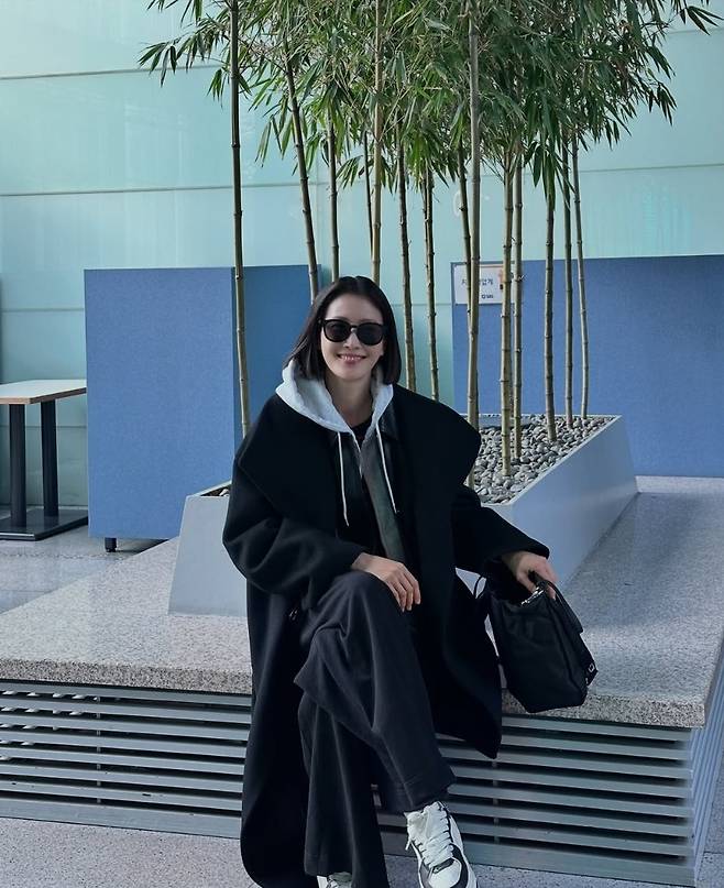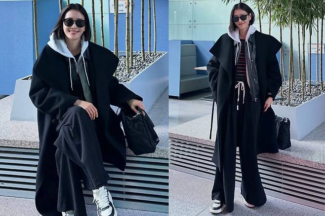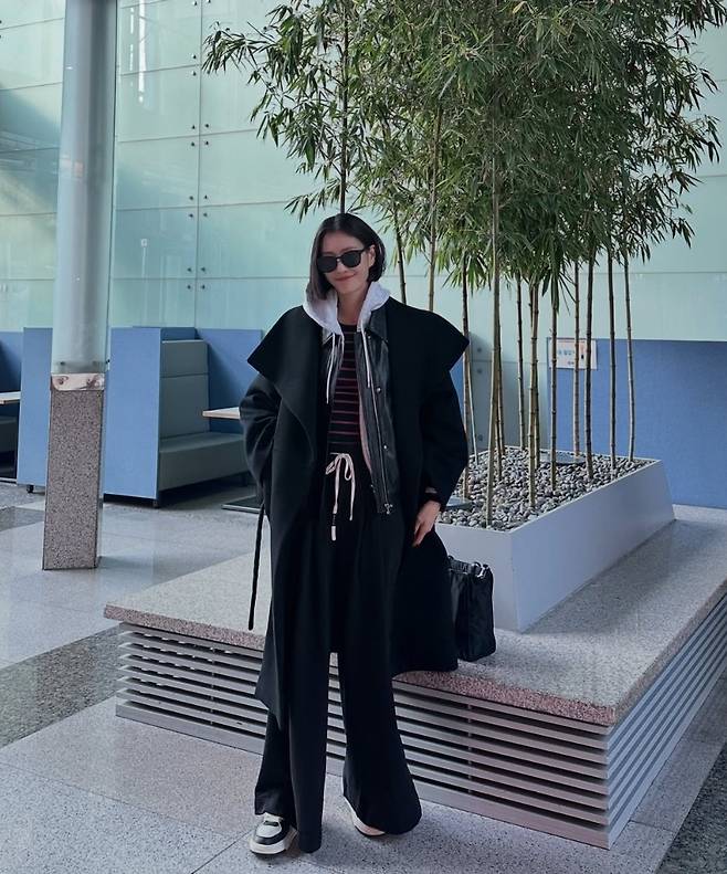 여기에 스니커즈와 빅사이즈 블랙백을 더해 전체적인 스타일의 밸런스를 맞추며, 공항 패션을 연상케 하는 자연스러운 시크룩을 완성했습니다.