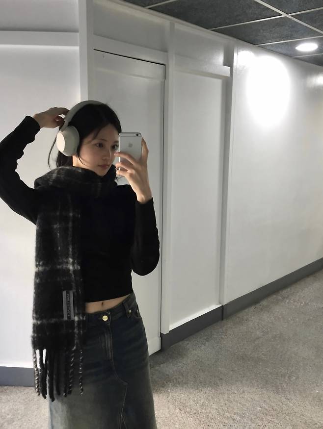 거울 셀카 속 우다비는 MZ세대의 트렌드를 반영한 힙한 겨울 패션을 소화했다. 블랙 크롭 니트 톱으로 허리 라인을 살짝 드러내며 답답해 보일 수 있는 겨울 룩에 개방감을 주었고, 굵은 체크 패턴의 머플러를 길게 늘어뜨려 보온성과 스타일을 동시에 챙겼다. 특히 헤드폰을 액세서리로 활용해 자유분방하고 쿨한 이미지를 연출했으며, 데님 소재의 하의를 매치해 전체적인 톤 앤 매너를 맞췄다.