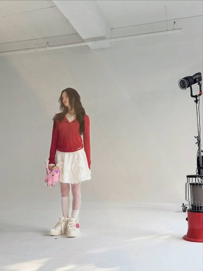 강렬한 레드 컬러의 긴 소매 톱과 풍성한 프릴 디테일이 돋보이는 화이트 미니 스커트의 조화가 사랑스럽다. 패턴이 들어간 화이트 스타킹과 볼드한 디자인의 운동화를 믹스 매치해 유니크한 감성을 더했다. 손에 든 핑크색 유니콘 인형은 전체적인 룩의 키치한 콘셉트를 극대화하며, 몽환적이면서도 신비로운 소녀의 이미지를 완벽하게 구현해냈다.