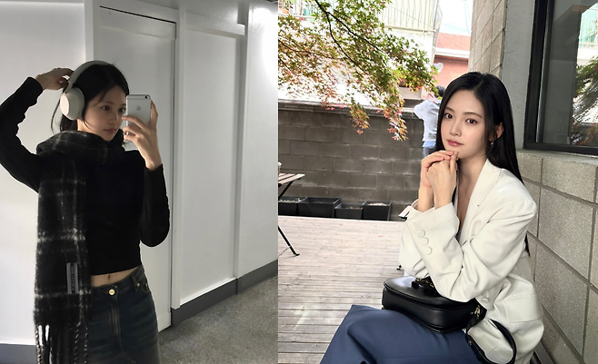 여유로운 오후의 한때를 담은 듯한 사진 속에서는 세련된 화이트 재킷 스타일링이 눈길을 끈다. 오버핏의 화이트 블레이저는 깨끗하고 맑은 피부 톤을 더욱 환하게 밝혀주며, 짙은 네이비 톤의 하의와 대비를 이뤄 모던한 분위기를 자아낸다. 여기에 클래식한 블랙 숄더백을 무릎 위에 가볍게 올려두어 격식 있으면서도 편안한 비즈니스 캐주얼 무드를 완성했다.