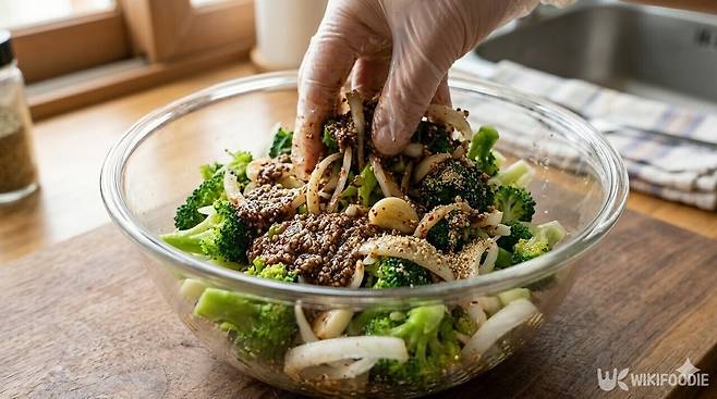 넓은 그릇에 식힌 브로콜리와 구운 채소를 담고 어간장 1큰술, 들기름 2큰술, 갈아놓은 들깨를 넣는다. 부족한 간은 소금 한 꼬집으로 맞춘 뒤 양념이 뭉치지 않게 조물조물 무쳐낸다. 들깨의 톡톡 터지는 식감과 들기름의 향이 브로콜리와 만나 색다른 매력을 전한다.