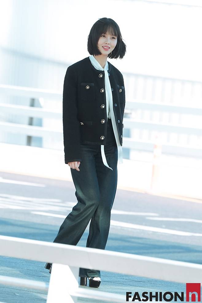 배우 김소현이 긴 리본 타이 셔츠 블라우스에 트위드 재킷 출국룩으로 상큼한 미모를 발산했다.