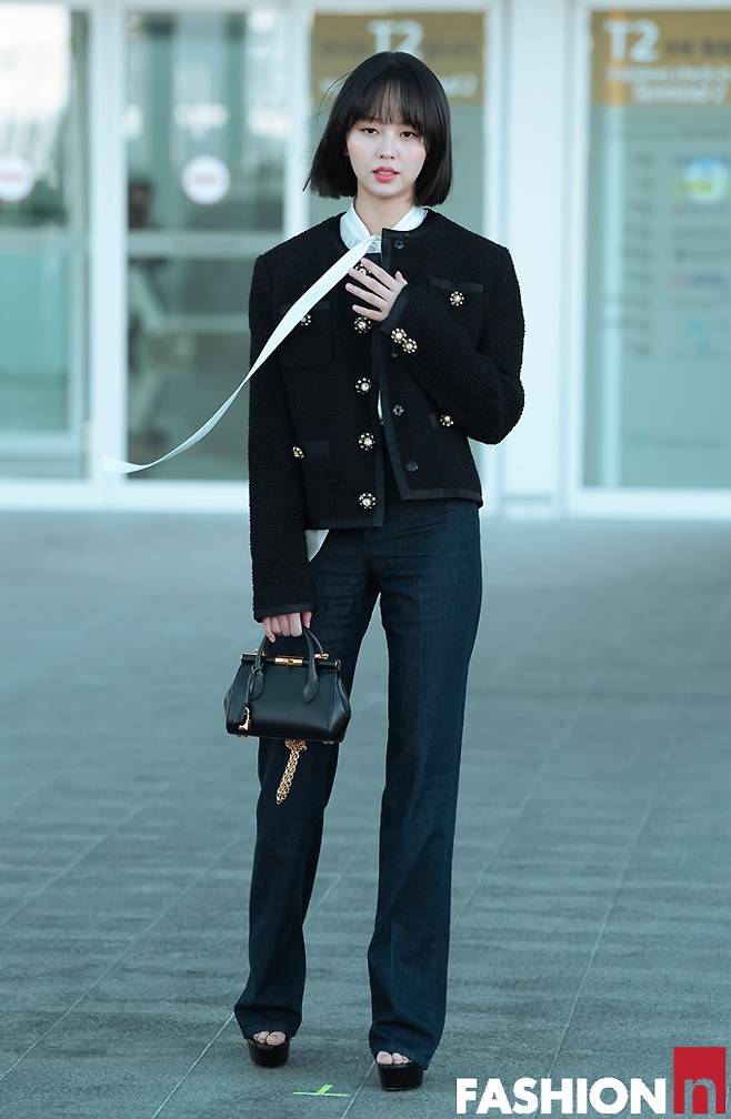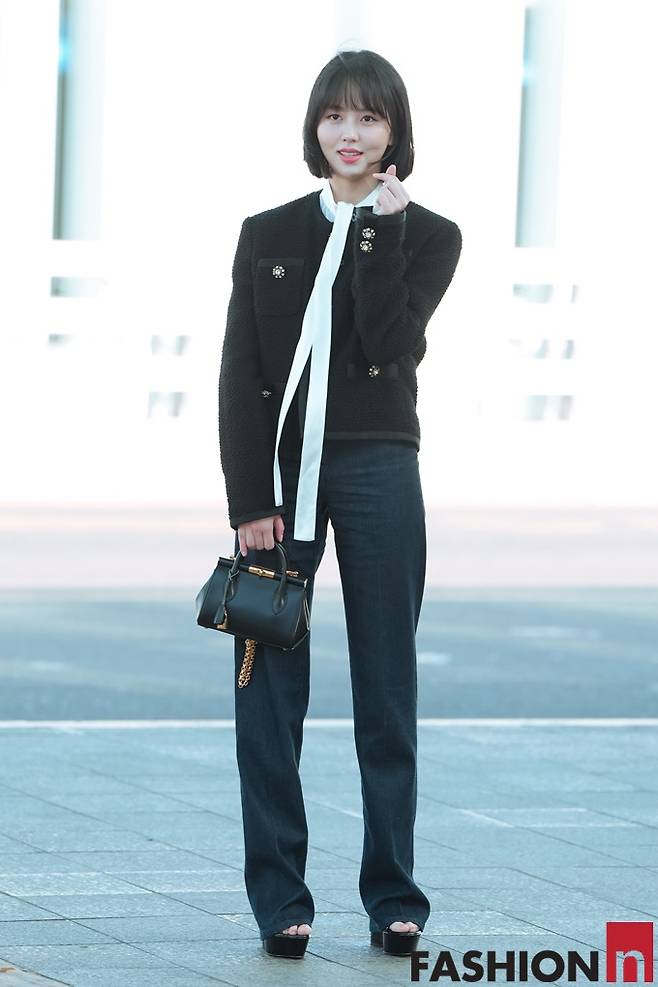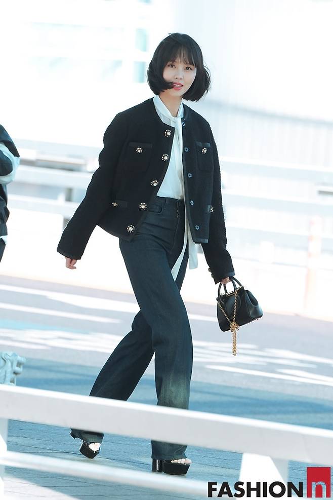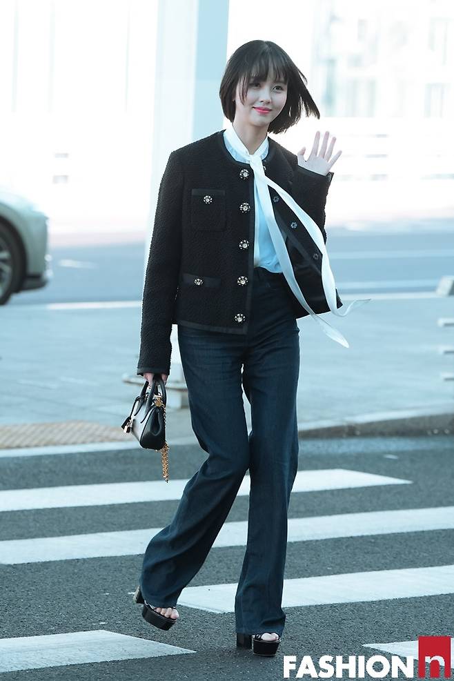 이날 김소현은 단발 헤어 스타일에 긴 리본 타이 셔츠 블라우스에 크롭 트위드 재킷을 입고 데님 팬츠를 매치한 출국룩으로 상큼하면서도 청순한 미모를 드러냈다.