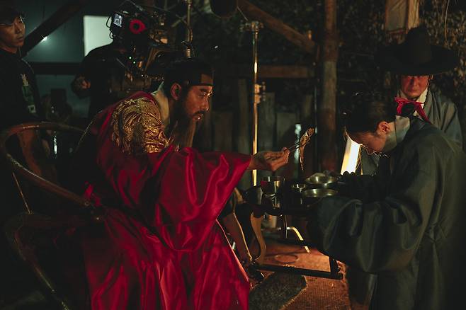 뿐만 아니라, 존재만으로도 촬영장의 분위기를 단번에 장악하는 차승원의 강렬한 눈빛은 그만의 카리스마로 그려낸 선조의 독보적인 존재감을 실감하게 한다. 한편, 궤짝에 든 잘린 코를 보고 놀란 그의 모습은 잔혹했던 당시 시대상을 한눈에 보여준다.