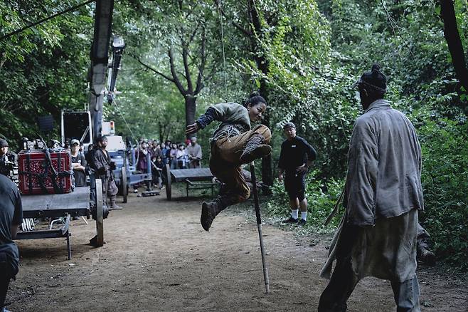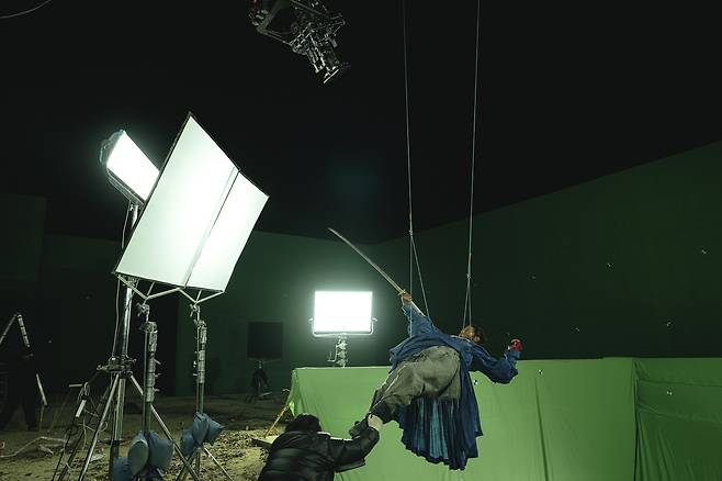 공개된 비하인드 스틸과 미공개 스틸은 열정이 가득했던 촬영 현장의 분위기와 밀도 높은 서사를 만들어낸 강렬한 순간들을 포착해 눈길을 사로잡는다. 먼저, 와이어를 활용한 고난도 액션 신을 소화하고, 비장한 눈빛으로 캐릭터에 완전히 몰입한 강동원의 모습에서는 부당하게 규정된 노비 신분에서 벗어나기 위해 끊임없이 고군분투하는 천영으로 분한 그의 새로운 얼굴이 돋보인다.