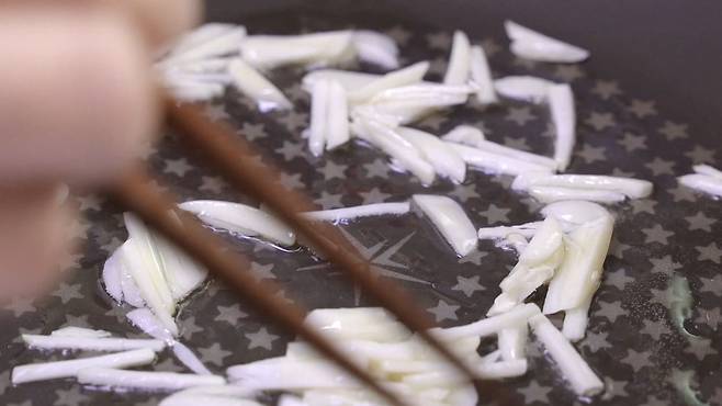 먼저 '중불'에서 식용유와 마늘을 넣고 잘 볶아 주세요. 마늘향을 미리 낸 후에 볶으면 향이 더욱 좋답니다. 약 30초 정도 볶은 후에