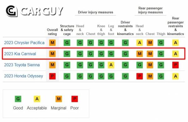 기아 MPV 카니발이 미국 고속도로안전보험협회(이하 IIHS)의 뒷좌석 탑승객 안전도 평가에서 부진한 성적을 기록했다. IIHS는 최근 미국에 판매 중인 혼다 오딧세이, 크라이슬러 퍼시피카, 토요타 시에나 그리고 기아 카니발까지 총 4대의 미니밴 충돌 시험을 진행했다.