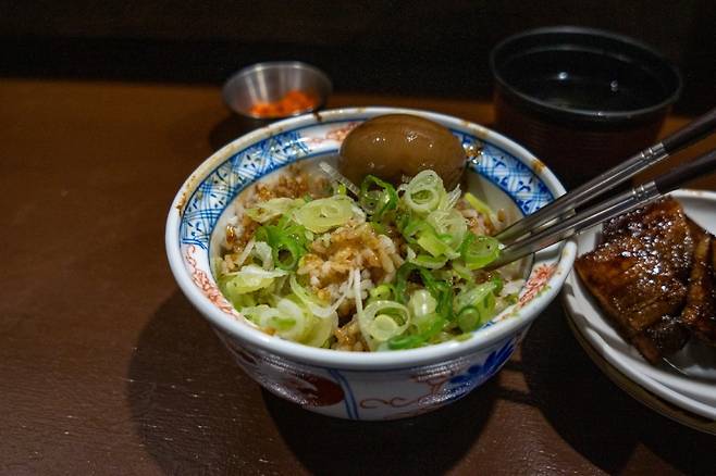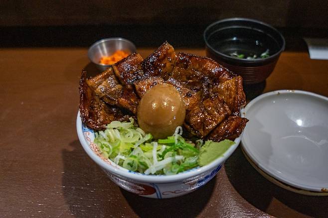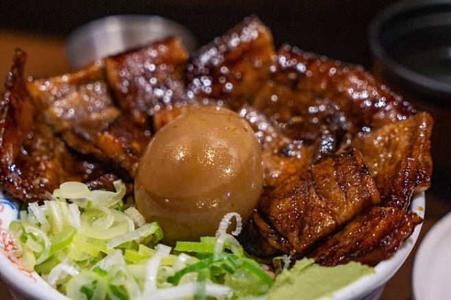 스미비부타동의 가장 큰 특징은 바로 ‘숯불’이다. 잘 구운 돼지고기를 가지런히 흰 쌀밥 위에 올리고, 그 위에 파, 계란 노른자, 김가루, 깨, 와사비를 얹어 낸다. 특히 파와 와사비가 이 가게의 포인트. 가운데는 간장의 풍미가 스며든 반숙 계란, 아지타마고가 자리 잡고 있다.