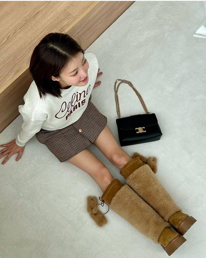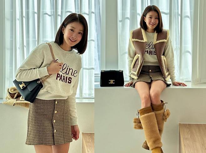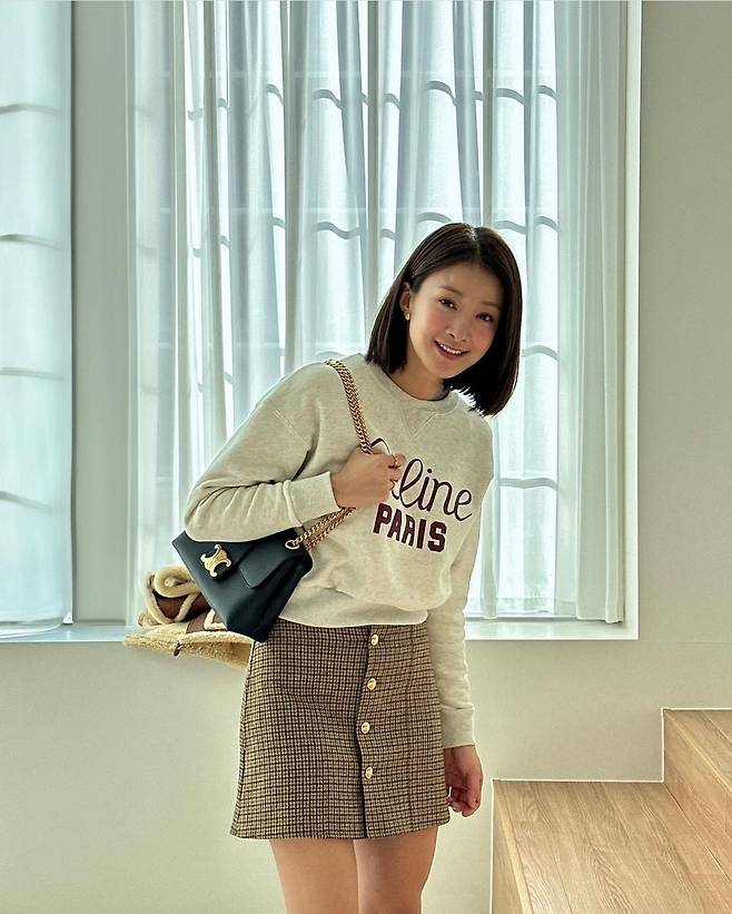 또, 이시영은 체크 패턴의 연갈색 미니스커트를 착용해 귀엽고 사랑스러운 매력을 발산했습니다.
