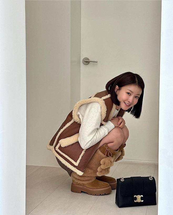 특히 이시영은 브라운 무스탕 조끼를 착용해 고급스럽고 세련된 패션을 완성했습니다.