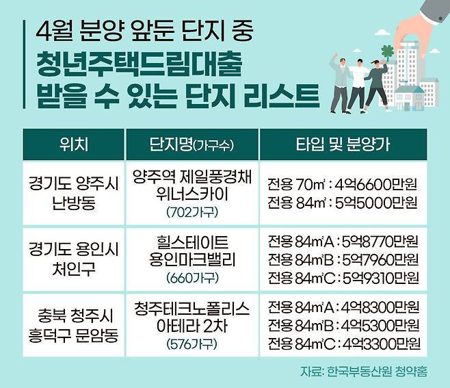 한국부동산원 청약홈에 따르면, 4월 14일부터 청약이 시작되는 경기도 양주시 난방동 ‘양주역 제일풍경채 위너스카이’(702가구)는 전용 70㎡, 84㎡가 대출조건에 맞습니다. 공급가는 전용 70㎡가 4억6600만원이고, 전용 84㎡는 5억5000만원입니다. 같은 날 청약이 시작되는 경기도 용인시 처인구 ‘힐스테이트 용인마크밸리’(660가구)의 경우 전용 84㎡ 타입만 해당됩니다. 전용 84㎡A타입은 5억8770만원, 84㎡B타입은 5억7960만원, 84㎡C타입은 5억9310만원입니다.