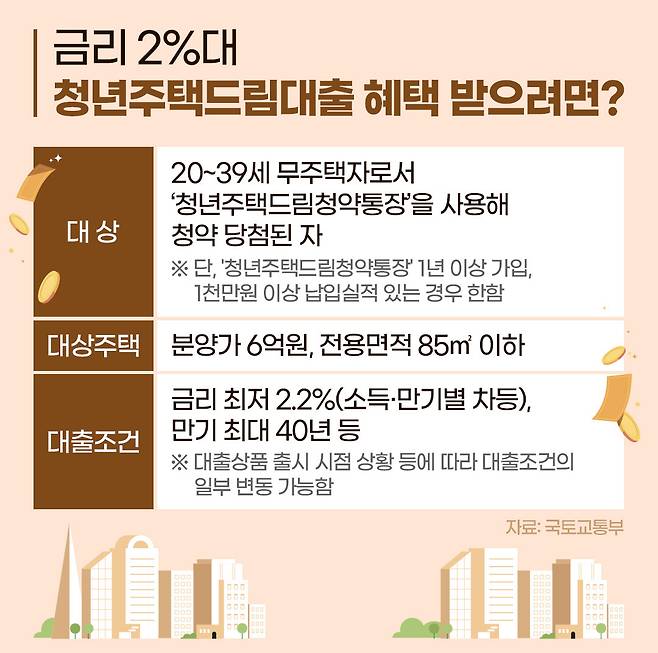 대출 대상자를 구체적으로 살펴보면, 20~39세 무주택자로서 ‘청년주택드림청약통장’을 사용해 청약에 당첨된 경우입니다. 단, 청년주택드림청약통장 1년 이상 가입하고 1000만원 이상 납입실적이 있는 경우에 한합니다. 대상주택은 분양가 6억원, 전용면적 85㎡ 이하고요. 대출조건은 금리 최저 2.2%(소득만〮기별 차등)이며 만기는 최대 40년입니다.