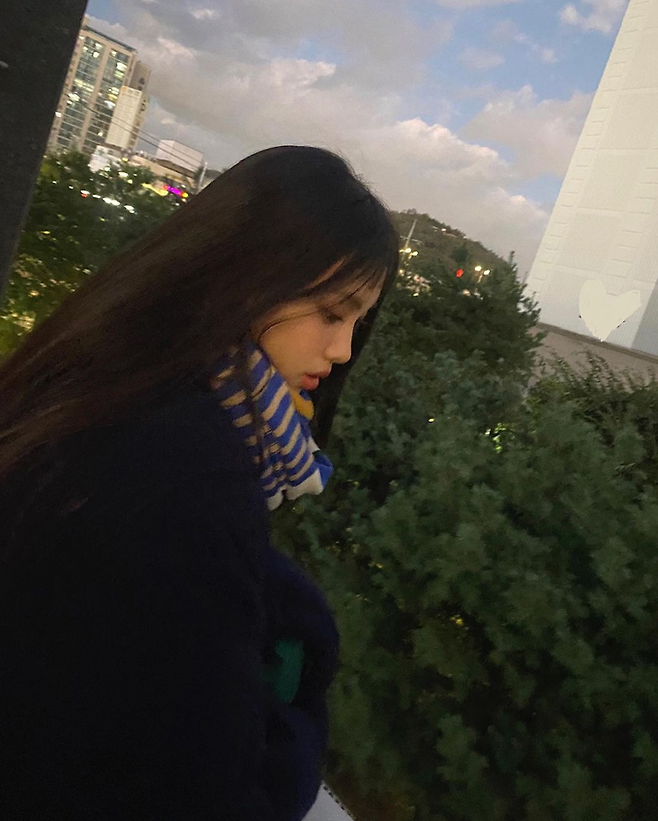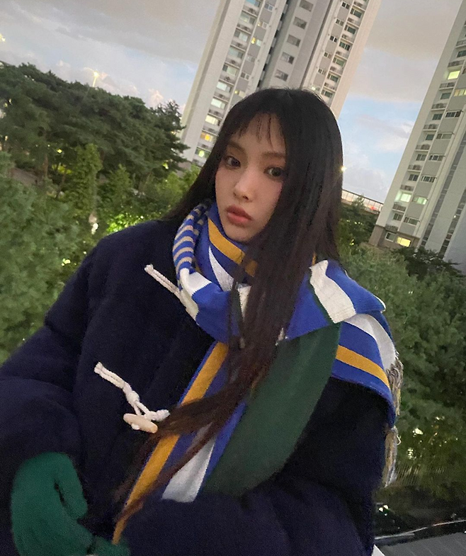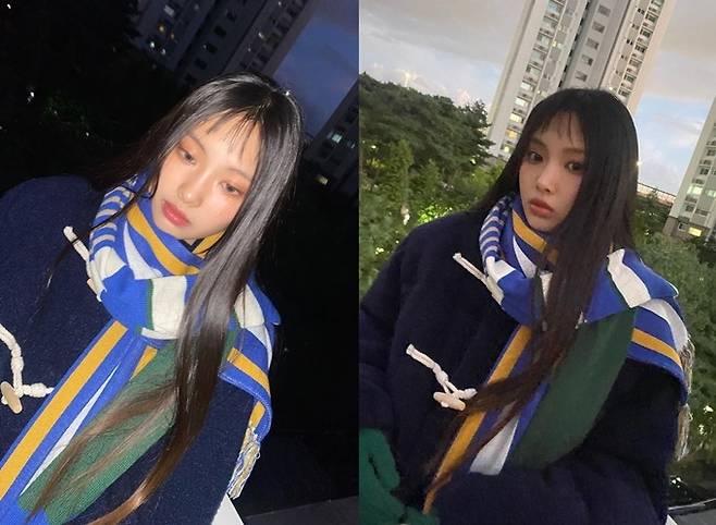 혜인은 5일 공식 인스타그램에 떡복이 코트에 컬러풀한 스트라이프 머플러를 두룬 풋풋한 캠퍼스 데일리룩으로 포즈를 취한 사진을 공개했다.