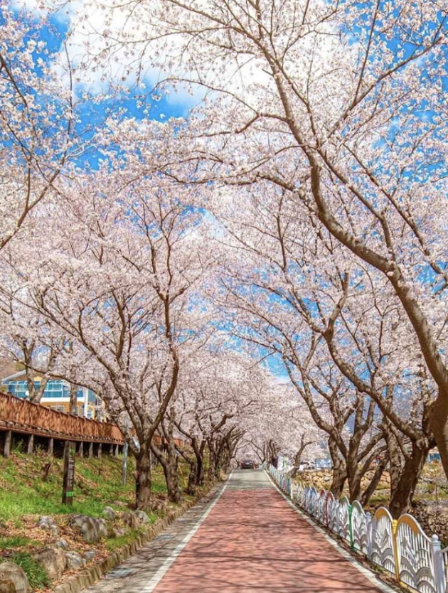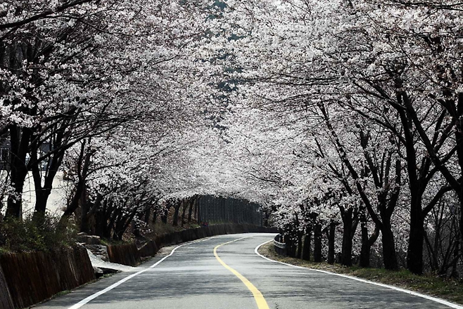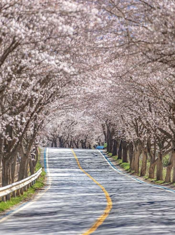 1,100여 그루의 웅장한 스케일: 길을 따라 심어진 50~100년생 벚나무 1,100여 그루는 하늘이 보이지 않을 정도로 빽빽한 터널을 이루며 방문객을 맞이합니다.