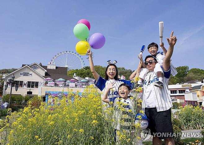 (서울=연합뉴스) 에버랜드가 어린이날, 어버이날 등 5월 가정의 달을 맞아 온 가족이 함께 즐기기 좋은 특별 프로그램을 다채롭게 선보인다고 28일 밝혔다. 사진은 포시즌스가든에 야구 유니폼과 응원용품들을 착용하고 놀러 온 가족의 모습. 2025.4.28 [삼성물산 제공. 재판매 및 DB 금지]